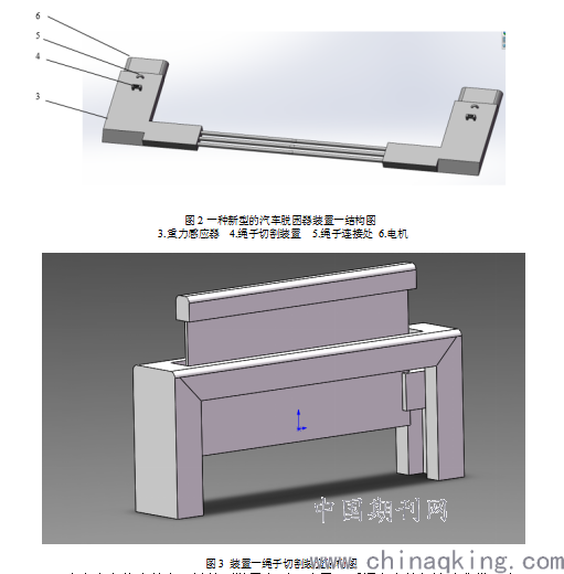 当汽车在较大的力下被拉到装置上时,由于一瞬间产生的加速度非常巨大,为防止本作品汽车来不及刹车,在经过绳子固定处时由于绳子长度不够而导致脱困器或者汽车发生毁坏,本作品在绳子固定处的前方放置了一个绳子切割器,当汽车轮胎压这个切割器时,其切割器上方的刀片将会把其底下的绳子割断,从而防止危险的发生。