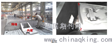 图三所见隔墙与风道组焊时,如果不做任何处理二者组焊后,不能保证隔墙与底架地板间的垂直度,正确的组焊方法是将风道下部2点向内侧取2mm与风道上部1点连线,把多余部分去除,再将隔墙与风道组焊,且隔墙两端用拉带做反变形后,先焊接风道里侧立焊缝,然后在焊接外侧立焊缝。
