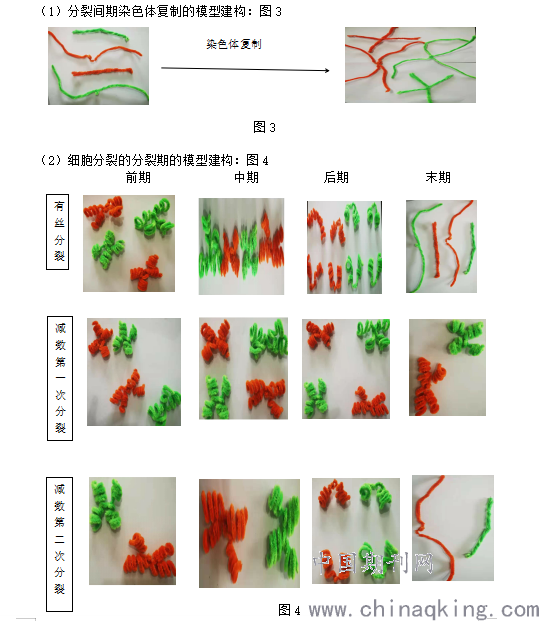 主要模拟细胞分裂过程中染色体的行为变化,细胞的分裂期人为的划分为前期、中期、后期和末期四个时期。所以分别建构四个时期染色体的行为变化的物理模型进行比较。围绕有丝分裂遗传物质不发生变化和减数分裂遗传物质减半的原则,提出模型假设。