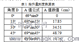 已知标准的病床背部折板长度C=69cm,在临床护理中经常用到的护理角度D=0o、15o、30o、45o、60o,将A和D值代入公式(1)中就可得到病床背部折板抬升量,用此抬升量作为抬升角度刻度,就可清晰明了表示,换算抬升量刻度表如表1所示。
