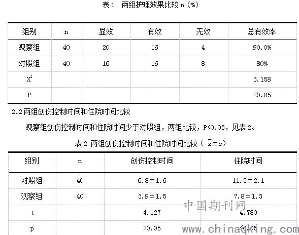观察组护理效果为90.0%,对照组的为80%,差异有统计学意义,P<0.05,见表1。