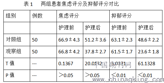 2.1两组患者焦虑评分及抑郁评分对比,采用人文护理后患者两种情绪均有改善,显示结果有意义(P<0.01)。见表1