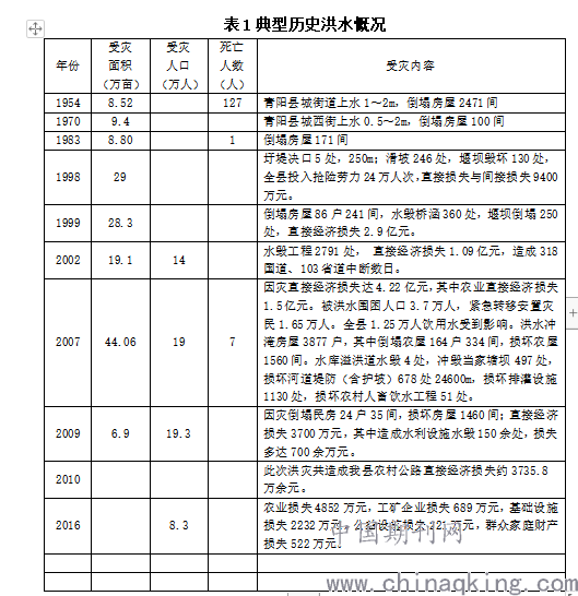 县内河流属山区涧溪河流,河道上、下游高差悬殊,源短流急,洪水暴涨暴落,两岸堤防标准低,洪涝灾害频繁,建国后洪灾较大的年份为1954、1970、1983、1991、1995、1998、1999、2002、2007、2009、2010、2016、2020年。具体历史洪水灾害概况见表1。