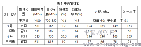 近期,我公司在制造某船用中间轴锻件时出现水、冒口两端冲击功偏差较大的问题。主要表现为锻件水口端冲击功较高,冒口端冲击功相对较低,如表1所示。