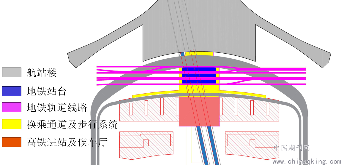 (1)交通中心换乘方式水平布局采用“输送量大优先换乘”原则,地铁旅客输送量超过高铁,布置在距离航站楼较近的位置。交通中心换乘方式垂直布局遵循“下重上轻”原则,由下至上依次为高铁、地铁和路侧交通系统。