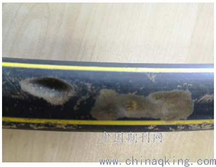 近年来,我国南方屡有蚁类(主要为红火蚁和白蚁)对PE管道侵蚀事件,造成管道降压使用,或者破损及泄漏,如图2所示。我国南方地区因气候和环境原因,为蚁类的孳生提供了有利条件。蚁类在潮湿或者有枯木的绿化带中筑巢繁殖,啃食燃气管道附近各种物质,危害燃气管道的安全运行。