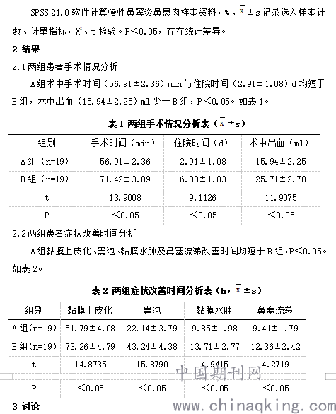 2018年6月-2020年6月,38例慢性鼻窦炎鼻息肉患者为样本,随机分组。A组,11例男、8例女,年龄30-61岁,均值(43.68±1.14)岁,病程1-18年,均值(3.64±0.75)年;B组,12例男、7例女,年龄31-62岁,均值(43.71±1.17)岁。选入标准:患者伴有流脓涕、鼻塞、嗅觉减退、头痛等症状;鼻内镜下可见鼻腔存在荔枝肉样组织、水肿、脓性分泌物等。排除标准:伴严重肝肾疾病、心脑疾病、恶性肿瘤类疾病。伦理委员会批准研究。对比慢性鼻窦炎鼻息肉样本资料,P>0.05。