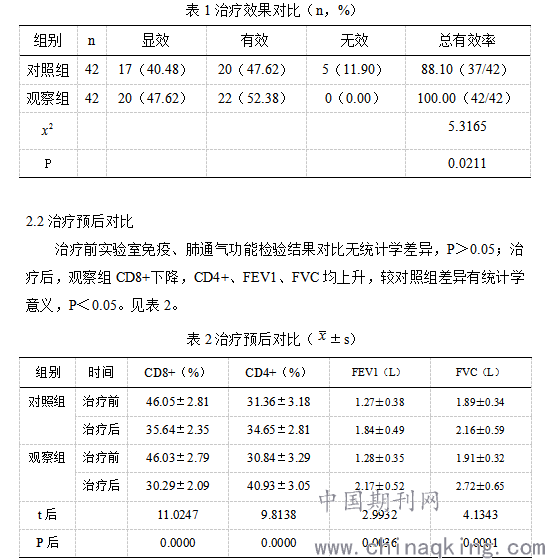 研究结果表明:(1)治疗效果:观察组治疗有效率高于对照组,差异显著,P<0.05。(2)治疗预后:治疗前实验室免疫、肺通气功能检验结果对比无统计学差异,P>0.05;治疗后,观察组CD8+下降,CD4+、FEV1、FVC均上升,较对照组差异有统计学意义,P<0.05。