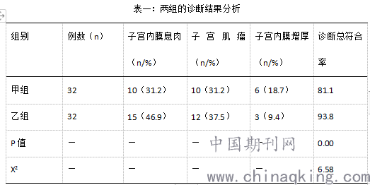 分析和对比两组的诊断结果,其中乙组诊断子宫内膜息肉、子宫肌瘤、子宫内膜增厚的准确几率分别是46.9%、37.5%、9.4%,整体诊断准确几率是93.8%,数据资料分析可知乙组的优势显著,如表一: