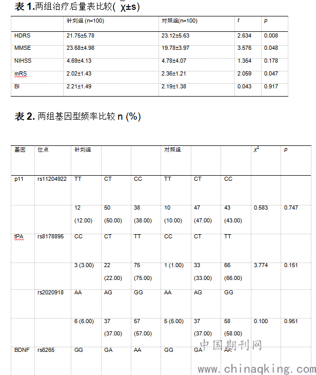 脑卒中后抑郁(Post-stroke depression,PSD)是脑卒中后常见的精神障碍并发症,发生率高达33%。研究表明PSD的发病 机制与p11/tPA/BDNF途径的基因遗传有关,最佳的相互作用模型为p11、tPA和BDNF [1]。针灸治疗能明显改善PSD患者的抑郁状态。本研究探讨针刺对PSD的临床疗效及对p11/tPA/BDNF通路基因的影响,为针刺治疗PSD提供遗传学依据。