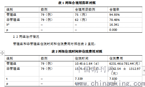 本次为了获得患者采用抗菌药治疗时采用药剂师参与抗菌药使用管理效果,应用了两组对照分析。从管理组和非管理组合理用药率对照中分析,管理组是94.93%,非管理组是78.48%,(x2=16.341,p=0.000),结果有差异。再从管理组和非管理组住院时间和住院费用对照中分析,管理组分别是10.45±1.64(d)、6231.46±781.44(元),非管理组分别是15.31±1.97(d)、9862.54±1312.97(元),(t=7.584,p=0.000),结果有差异。从上述分析获得,患者临床使用抗菌药治疗时采用药剂师参与用药管理方法效果优良,该方法可推广。