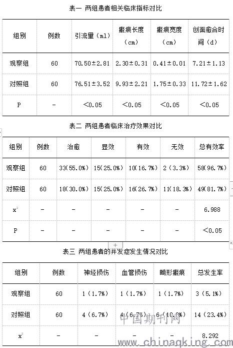 针对两组患者在正式进行手术治疗之前,都在患者穿刺病变的位置进行抽液,并实施相关培养和药敏试验,对患者进行B超检查,对其是否存在脓肿的情况以及脓肿的实际大小等诸多方面情况加以确立。(1)针对对照组患者采用传统切开引流术进行治疗:在患者脓肿最低处同时瘢痕相对隐匿的位置进行手术切口,切口的大小应根据患者脓肿的大小和深度加以确立,确保引流较好的通畅性。进行切口到皮下以后,应用血管钳实施钝性分离处理,直到脓腔,确保每一个受累间隙能够被充分分离,执行冲洗操作,应用乳胶管进行引流处理,同时使用无菌纱布加以覆盖。针对敷料,每日中应根据患者敷料实际的渗透状态加以更换,一日1-2次。具体执行更换敷料操作的过程中,对于脓腔应用过氧化氢和生理盐水实施冲洗处理。相隔1-2日以后,针对患者的创面实施渗液病原学检验,根据其相关药敏试验和细菌培养的结果选择使用对应的抗生素进行治疗。在患者创面出现新生丰满的肉芽以后,没有脓性物分泌的情况下,便可减张创面缝合出院。(2)针对观察组患者采用微创切口联合负压引流的方法进行治疗:手术切口的条件和对照组保持一致,切口的长度将血管钳对脓腔的分离作为标准,宽度应小于2厘米,深度至患者相应的皮下组织,然后通过B超予以引导,对脓腔进行分离处理,彻底将脓液从中排出。与此同时,应用过氧化氢和生理盐水轮流交替并重复不断执行冲洗操作。然后取来相关高负压材料根据患者创面的实际形态对其外形加以修剪,并在创面中完成置入操作,保证材料的充分铺平,这样才能更好地引流到每一间隙中。记下来在患者皮下实施游离减张处理,将冲洗管和引流管均布置于高压材料中,闭合创面。患者回到病房以后,应用生理盐水(用量为500毫升)对冲洗端进行冲洗,每次时间为4小时,在间断期给予生理盐水进行清洗,并和纯氧导管进行连接,5升/分,对于负压端,连续进行24小时的吸引,压力为40-60千帕,直到冲洗液展现为清亮状态。在患者病情有所好转以后,将相应的负压引流装置取出,同时采用6.0美容缝线对患者的创面进行缝合处理。