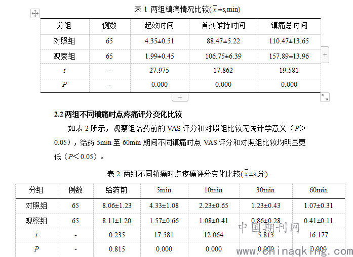 如表1所示,观察组起效时间明显快于对照组,首剂维持时间明显长于对照组,镇痛总时间明显长于对照组(P<0.05)。