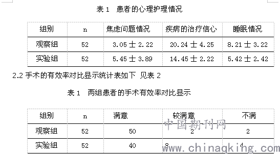 实验组采用传统常用的护理要求进行护理,给予相应的健康指导,以及疗效关注,而针对观察组的52例患者则给予全面的围手术期护理服务,从术前准备工作到术后整体的护理,加深对心理护理,健康教育,心理沟通等相关问题。