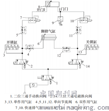 铁路客车电动控制气动温室门主要由轴承传动机构、拉门控制系统、门锁、控制装置、拉门面板、转向板、转向架传动机构、其他密封件等附件组成。在阀门开启和关闭过程中,门风扇沿铁路运行;拉门关闭后,拧紧拉门框架,与车身外侧对齐;当门打开时,它平行于汽车的车身旋转门的气动系统主要实现门的开、关、踏板的旋转以及门的解锁和锁定,如图所示。