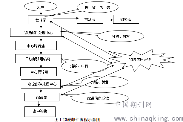 中国邮政物流业务,整个实物流程包括收寄、运输、配送等环节。示意图如下图1所示: