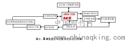 技术方案是:该系统以ARM 2138单片机为微控制处理器,由1个光纤HFBR-1414发射器连接一个16路光纤分路器与16根光纤及16个光纤HFBR-2412接收器配合使用组成一套16路光纤链路传感器。3.2寸TFT液晶显示屏输出显示每条被测电缆在线监测状态,当出现异常时单片机启动声光报警装置现场警告,同时由单片机串口通过IE608070-5-103规约与变电站通讯管理通讯。