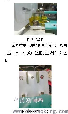 试验结果:增加绝缘条后,放电位置发生转移,放电电压提高至11000V。