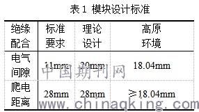 模块的绝缘配合设计是按工作电压1800V、过电压等级OV2(参考 GB/T25122.1-2010)、污染等级PD3(参考TB/T3213-2009)条件下执行[3],如表1所示。